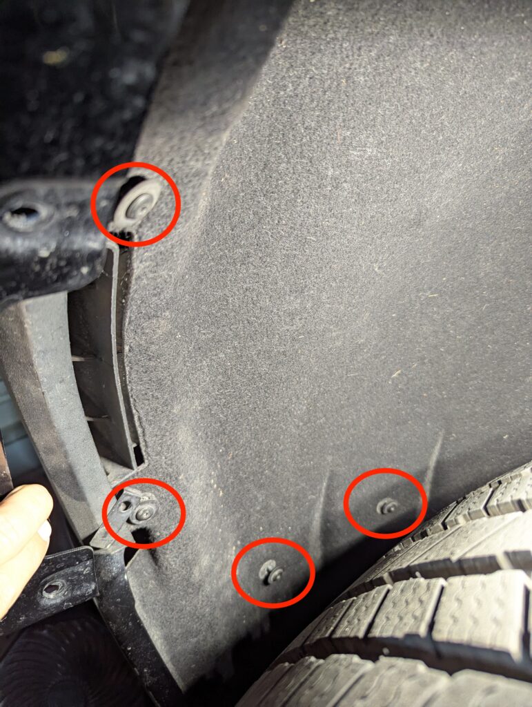 - Remove 4 T-15 Torx screws from the fender liner (circled in red below)