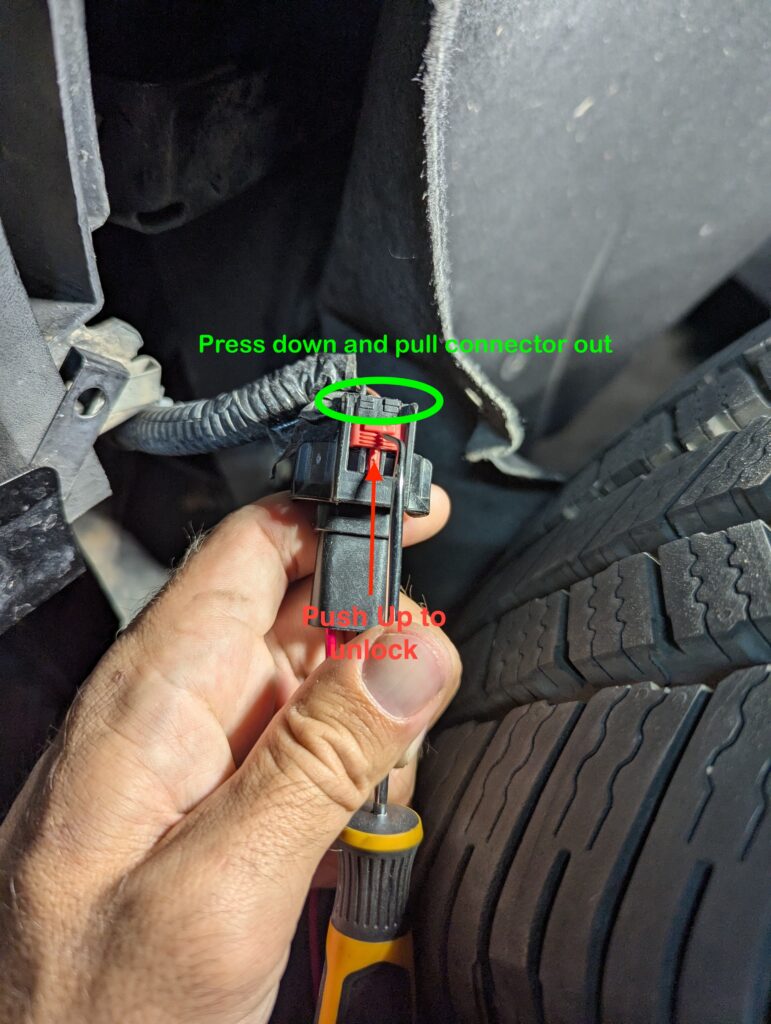 - Disconnect the electrical connector plugged into the back of the fog light (below it is demonstrated outside of the foglight so you can see how to unlock the connector)
