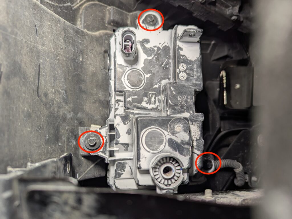 - Undo the 3 mounting bolts on the fog light with a 7mm 6 point socket (circled in red below)
